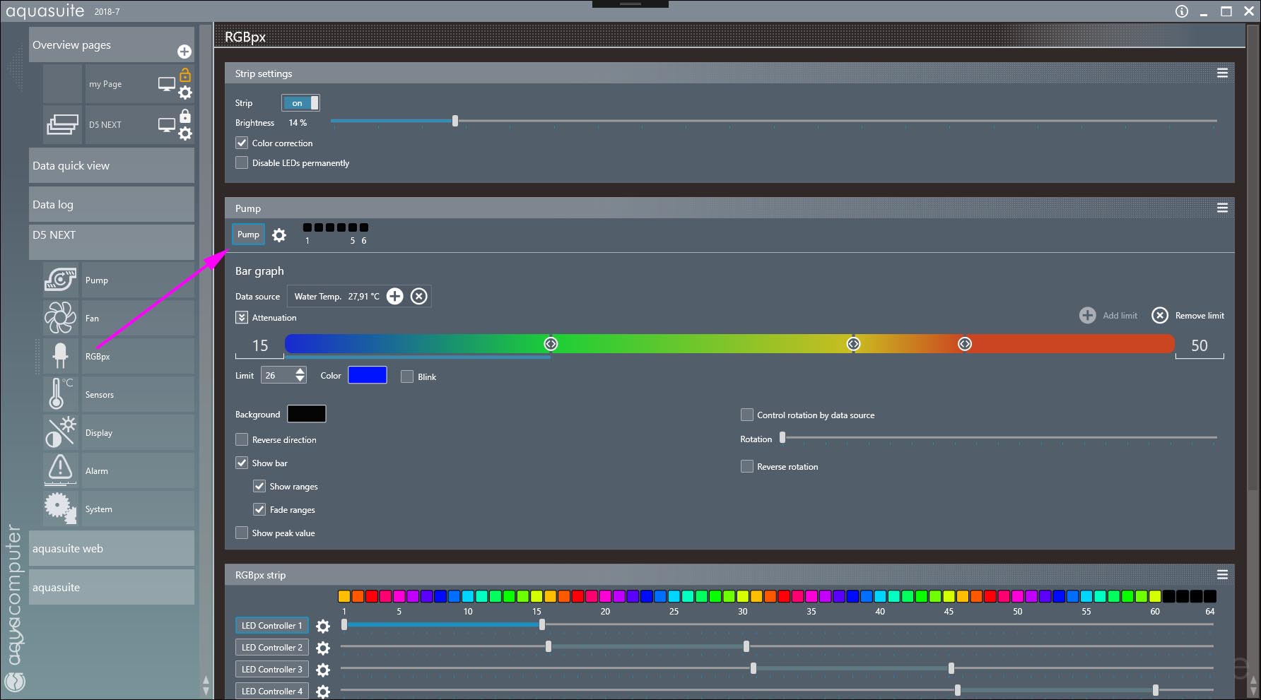 The D5 NEXT's LEDs are controlled internally in the pump from the RGBpx tab in aquasuite. d5rgb.jpg