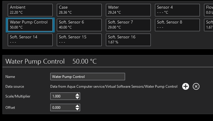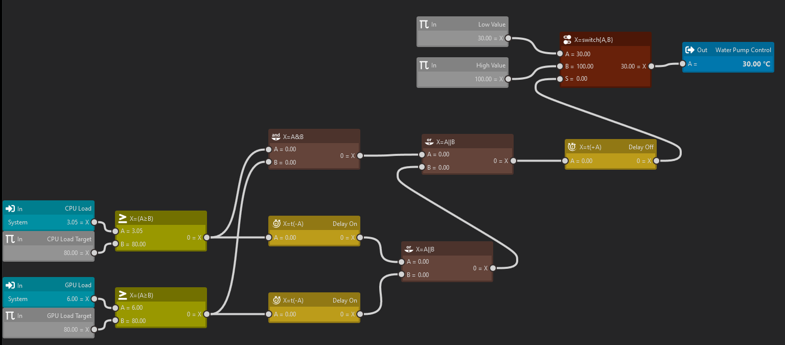 This can then be attached to a Soft Sensor and in turn used on a fan crve for the water pump however due to the config it will only ever output 50c or 100c (adjust values to suit)