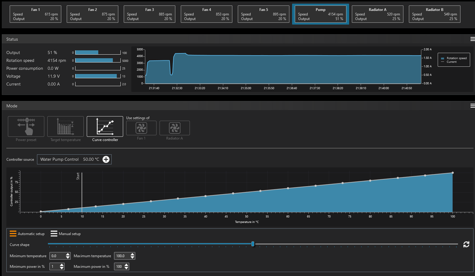 In this very quick Demo (and I've quickly tweaked my settings to give me the pump speed I want at idle/low load (which is actually a virtual 30c) ) if you watch the pump speed on the bottom left as both the CPU & GPU go above 80% average load for the 30 second period I've defined as a buffer the Water Pump gets sent a virtual 100C which, based on the fan curve) ramps it up to 100%.