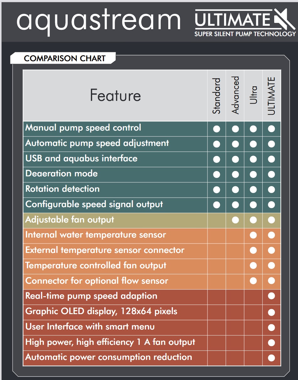 Here is the comparison chart for the different Aquastream Pump versions: