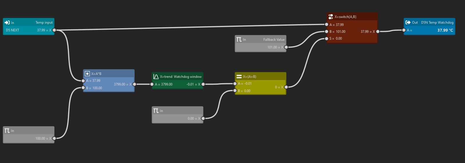 I had initially assumed that the calculation was handled to more sig figs than on display, but then I noticed that the switch was triggering sometimes even when I saw the raw temp value moving .01C. Adding the multiplier doesn't add any precision to the temp value, but it effectively does add them to the trend calculation. The .01C changes that had been shown on the Trend function as 0 are now getting processed by the Equals function as non-zero.