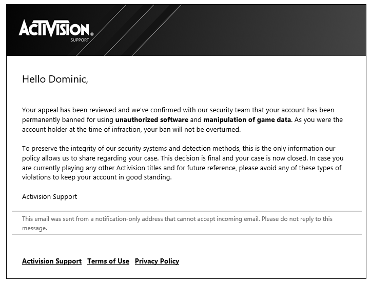 The MMO FPS commuity being so toxic, i can't blame Activision for behaving the way they do.. it sucks if you are honest, but i'm sure they get hammered with requests from cheaters that got caught and try to play nice