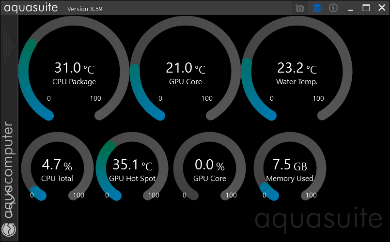 Note, there's not a lot of load on in this screenshot. But while gaming, the max CPU I've seen is a momentary spike to ~54C then quickly back to well under 50C. I'm currently running my system at 75% pump speed and 50% fan speed. I'm still figuring out how to drive Aquasuite and will set some fan ramping once I get my head around it.