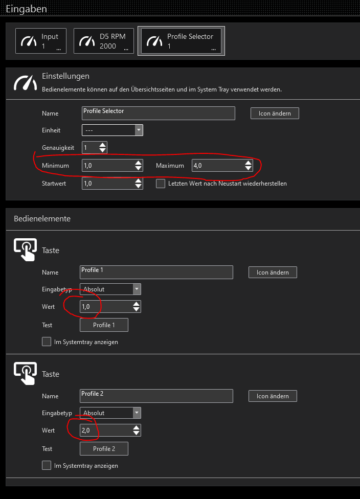 As you can see, there's a box I copied from a default page that shows the profile in use, currently 3 (green), but I'd like to make similar ones to set a specific profile.