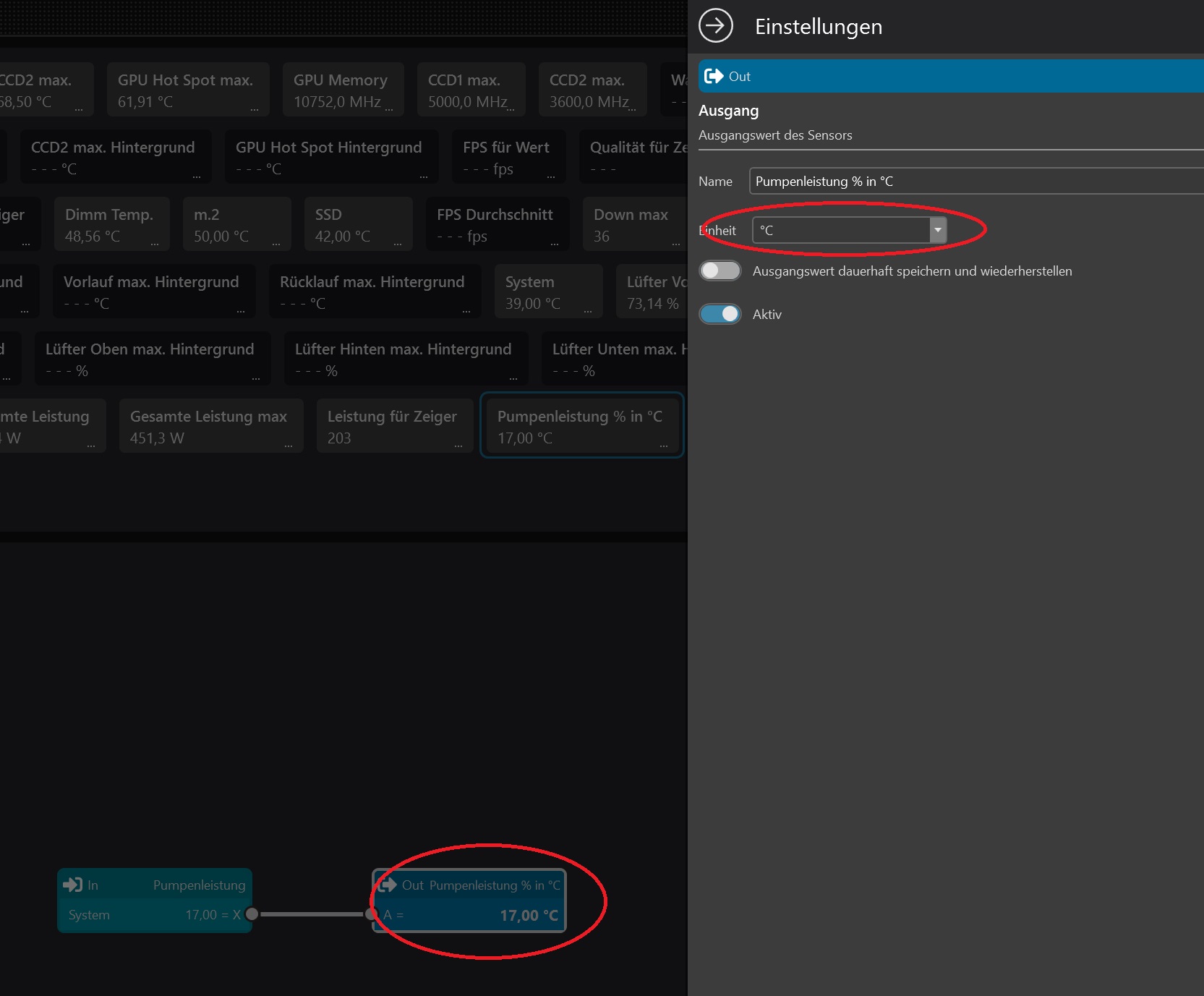In this example, I have to convert a value that I enter via "Inputs" in "%" 1:1 into a temperature in order to control the speed of my D5 Next