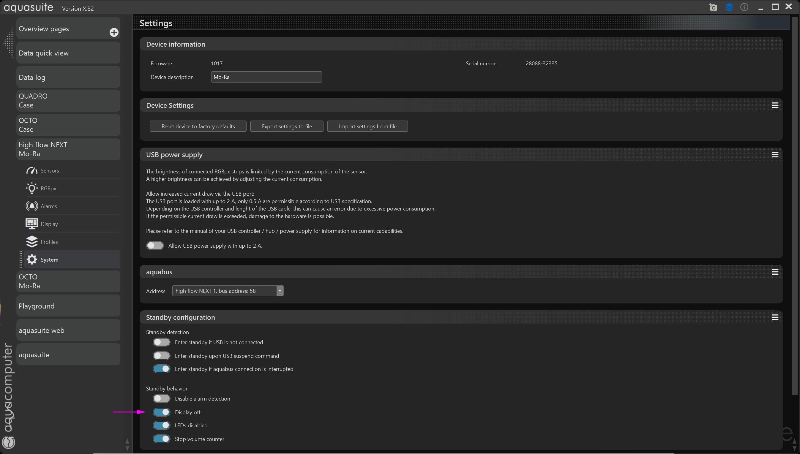 As I have no aquabus connected, the 'Standby' function is always triggered, and the display is always off.