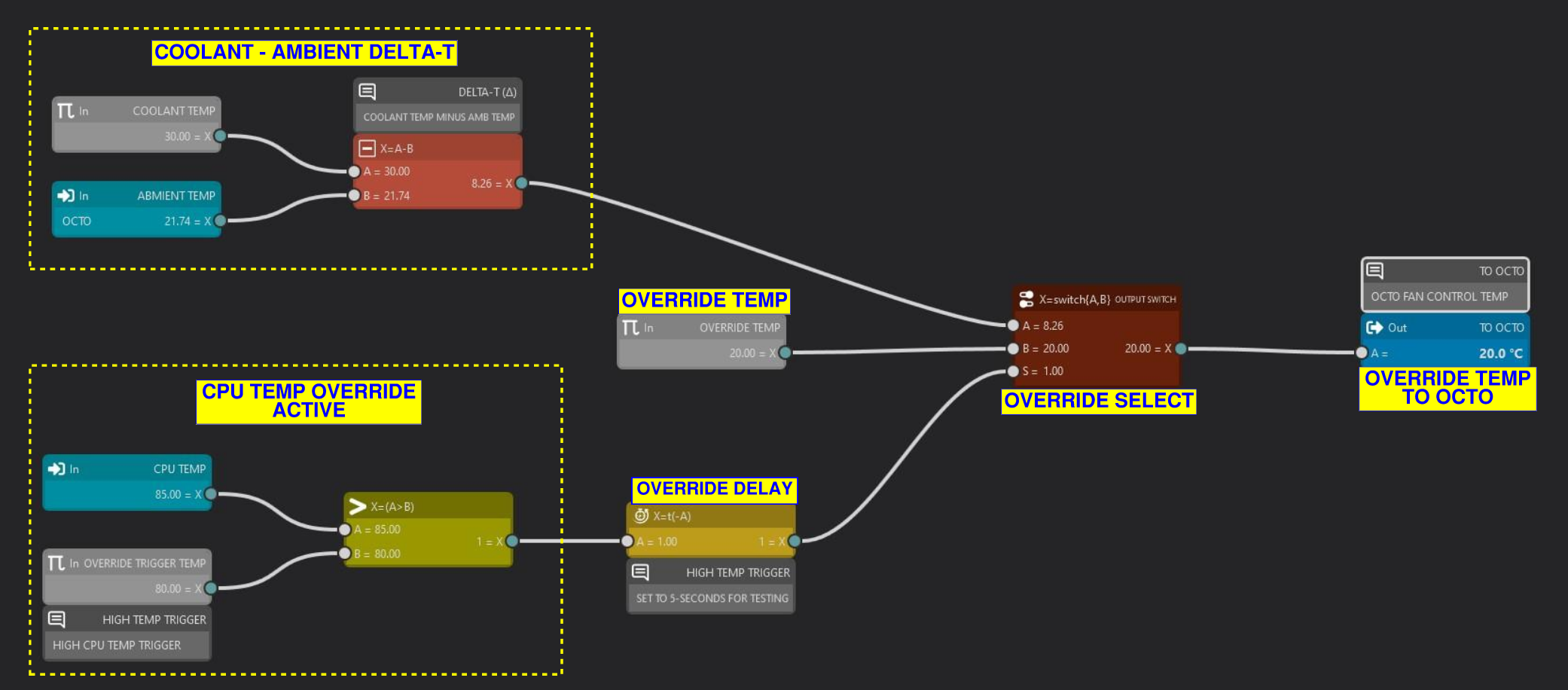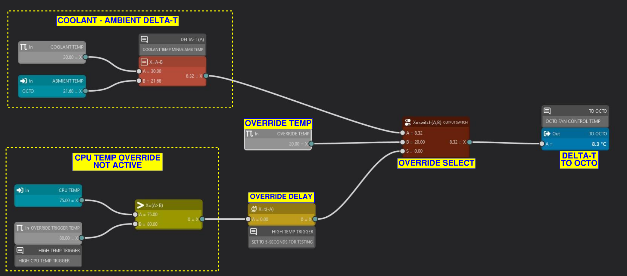 I set up the attached in the Playground. The upper left area subtracts Ambient Temp from Coolant Temp to get Delta-T. This value is passed through the Override Select switch when the CPU Temp is lower than the Override Trigger Temp. The lower left area compares the CPU Temp to the Override Trigger Temp. If the CPU Temp exceeds the Override Trigger Temp, the On Delay counter starts counting. When it reaches the Override Delay Time, the output of the On Delay block goes High, which causes the Override Select to switch to the Override Temp (input B). I set this constant to 20. When the Override Select S-input is High, the Override Temp is sent to the Octo. The Octo has a fan speed curve based on Delta-T, which normally never goes above 10°C. When the Override Temp gets sent to the Octo fan speed curve, it will set the fan speeds to 90%. They will stay at that speed until the CPU Temp drops below the Override Trigger Temp. When that happens, the Override Select switches back to the Delta-T Temp (input A). I am emulating some of the values in this test setup and have not tried it live with my Octo. It could certainly be refined a bit, but the general idea appears to work.