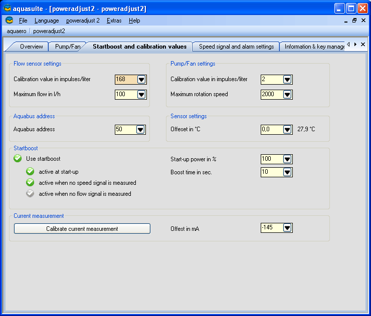 The poweradjust 2 is a controller which was optimized for the use with a Laing DDC pump but you can also use it for other things with a constant load of up to 25W at 12V. The maximum surge current can go up to 48W so you have enough reserves for the massive starting current that some pumps or fans generate. A freely configurable startboost allows you to make sure that for example a pump has enough time to spin-up before it is getting slowed down by the controller. That feature also works if the speed or flow rate signal gets interrupted.