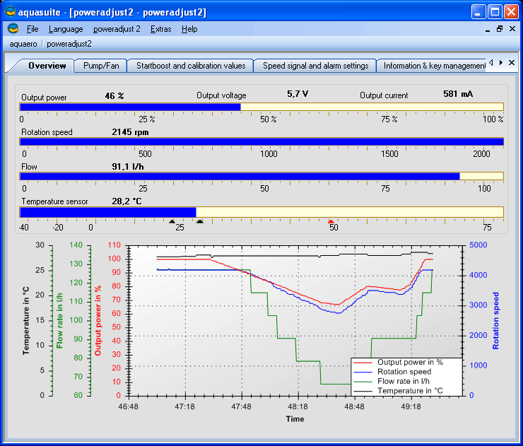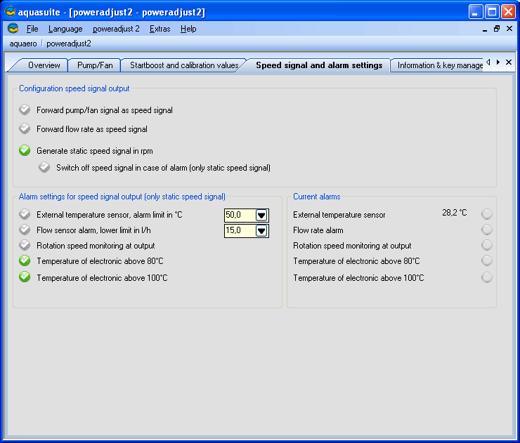 As you can already see on the photos the size of the passive cooling block is much bigger now to dissipate the heat which is generated by the voltage regulator. A two-stage overload protection will guard your poweradjust 2 against possible damages if the voltage regulator is getting too hot. Additional alarm settings for the temperature, flow rate and speed signal will give you full control.