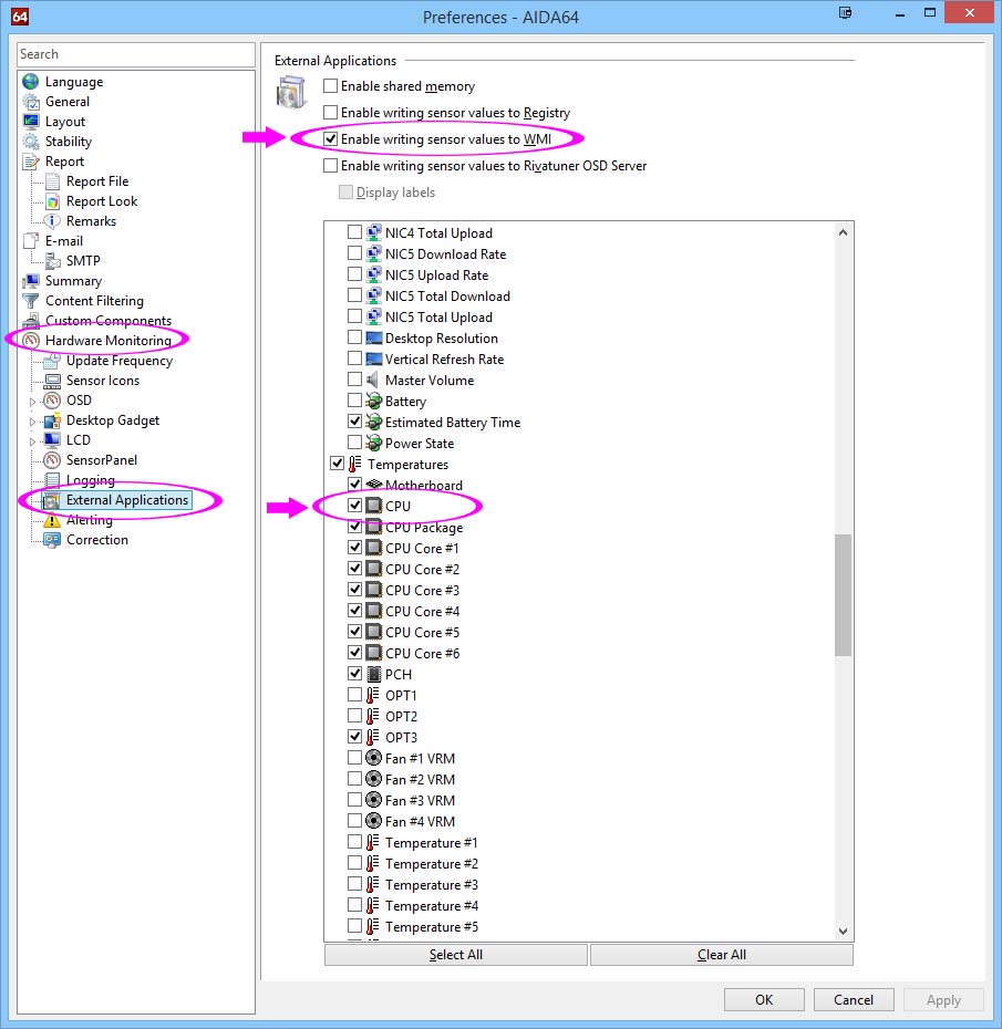 Check "Enable writing sensor values to WMI"