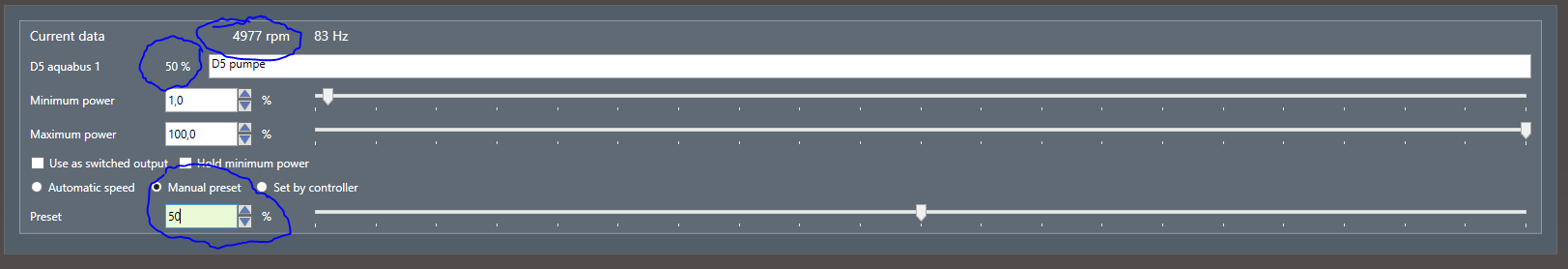 So I picked up my new AquaComputer D5 pump with build-in AquaBus and USB support today, and I hooked it up to the "AquabusHigh" connector on my Aquaero 5 LT. The pump appears in the pump section in aquasuite, I then set the pump speed to "Set by controller" and added it to a controller based on the CPU temp. When I go to the pumps section in aquasuite, it says that the pump is running at 1-5%, but at 5000+ rpm, which is what it should run at at 100% (pic below). So does anyone have an idea of what I configured wrong in AquaSuite? This pump is obviously supposed to be adjustable, and I want it to run at about 1000-1800rpm at idle.