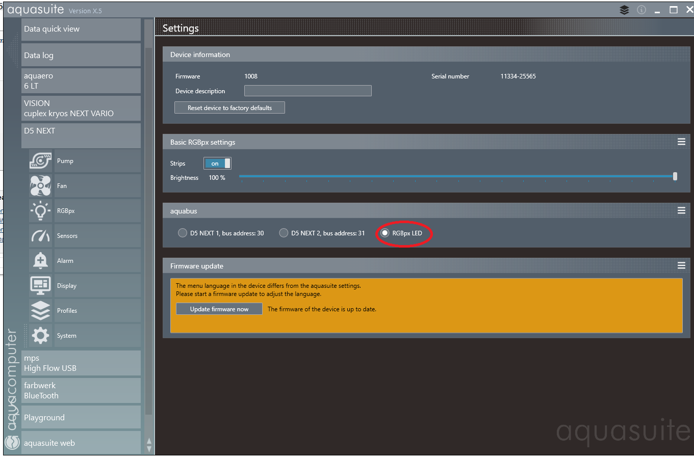 After starting my system for the 1st time Aquasuite did update firmware on D5s. Now after I choose in aquabus RGBpx LED there is only a quick blink and strips seam dead.