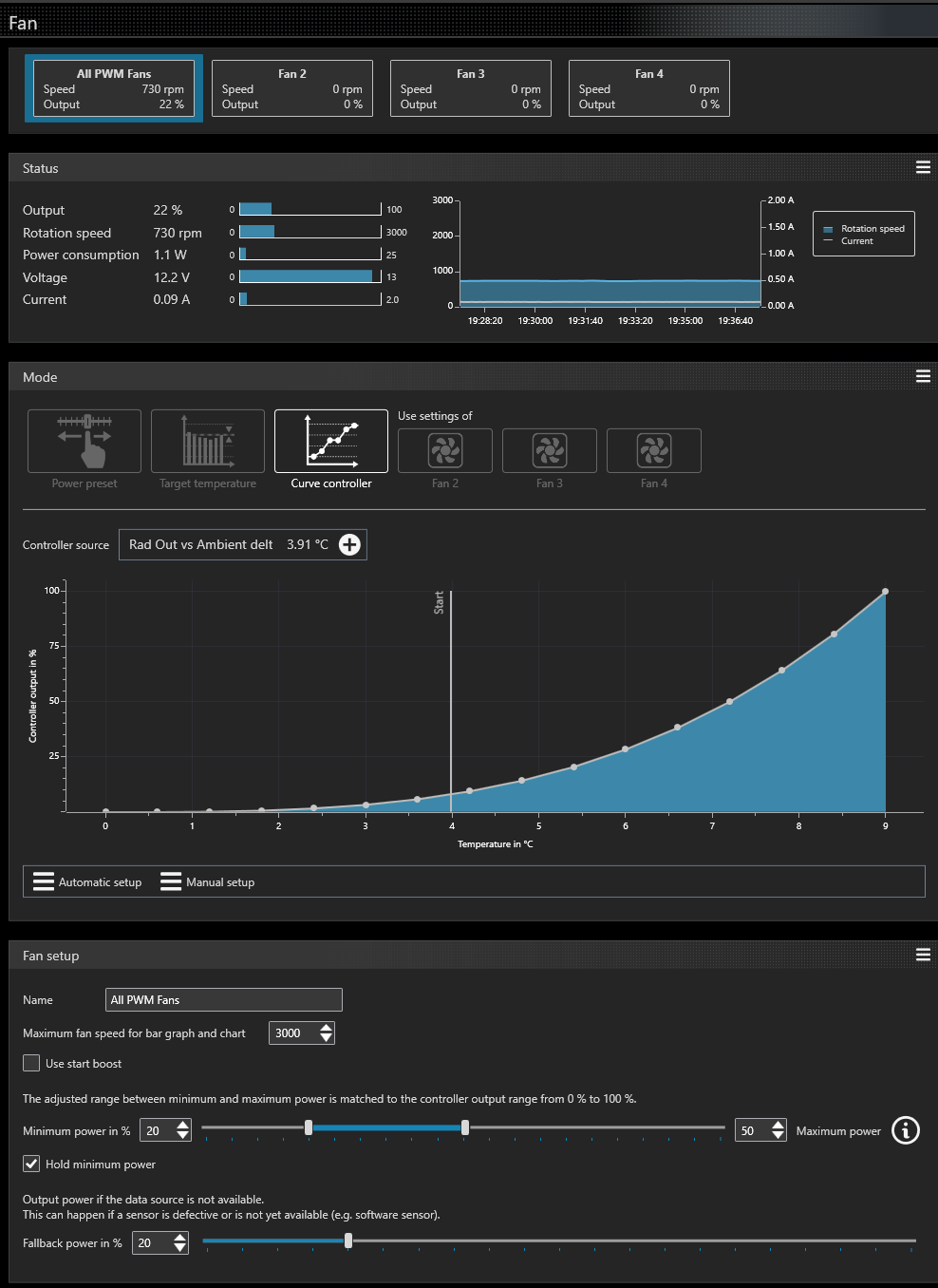 High limit is like with the pump, the highest speed possible while maintaining low level noise (in my case 50%) and while able the keep DeltaT<=MaxDeltaT* (less or equal max ambient vs rad out delta)