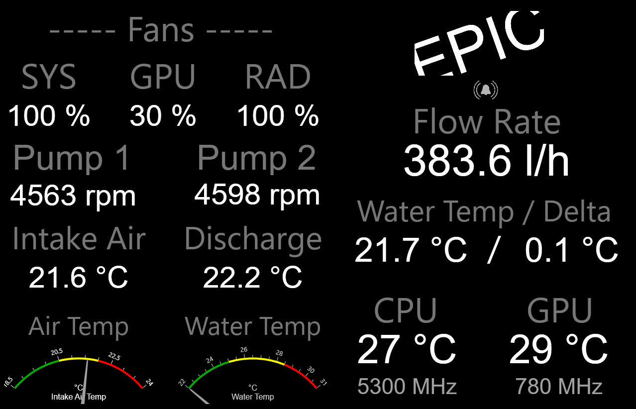 Dual pumps on far top left, bottom pump and top pump (in series, set to slightly different speeds), and CPU performance core readouts centre, below the GPU / CPU bars.