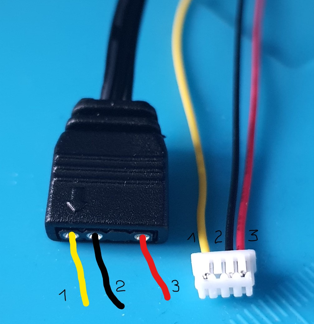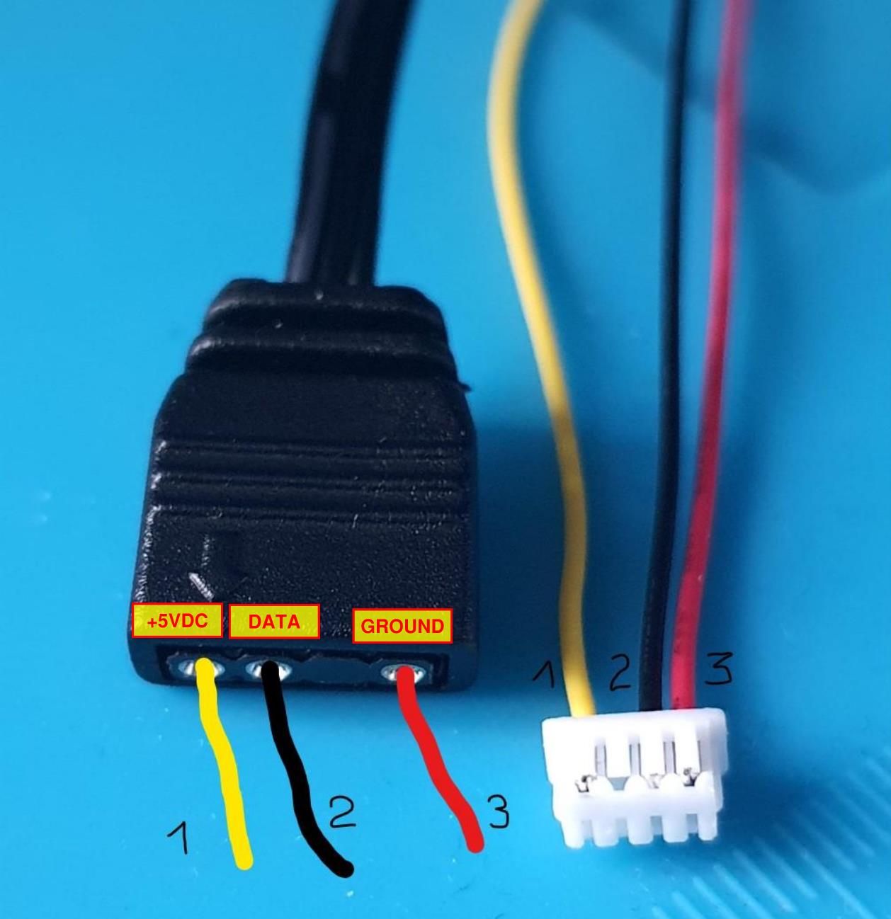 As it looks like its going to take a while for my RGBpx adapter to arrive, I figured I could experiment with my RGBpx extension cable, cut off the end, and splice it into a aRGB cable. Unfortunately I can not find any information showing what wire is ground/power/data. Does anyone have any information on this?