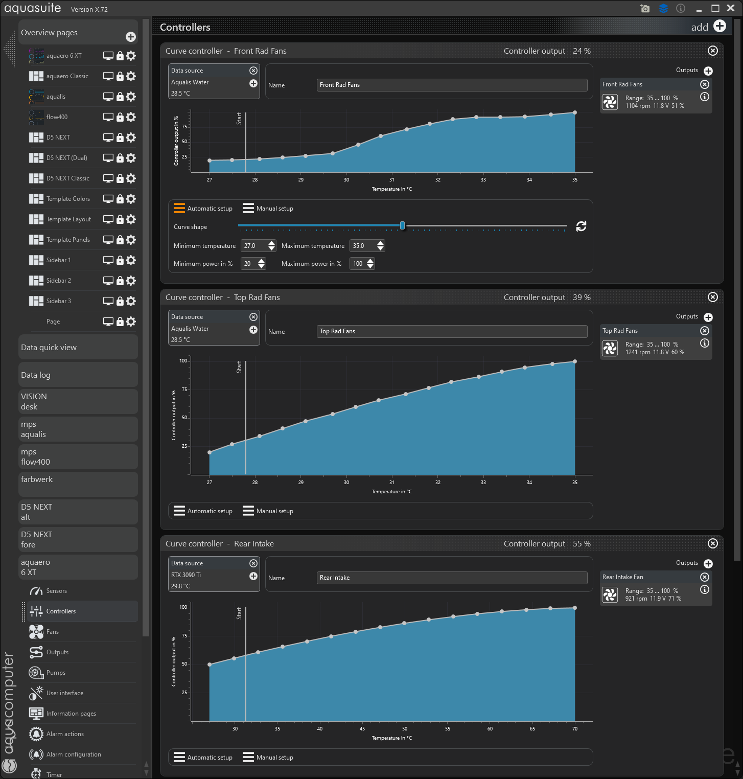 Aquaero has curve controllers. Here is a screenshot of when I set up using AQS. They are massively helpful in tuning noise to performance ratio.