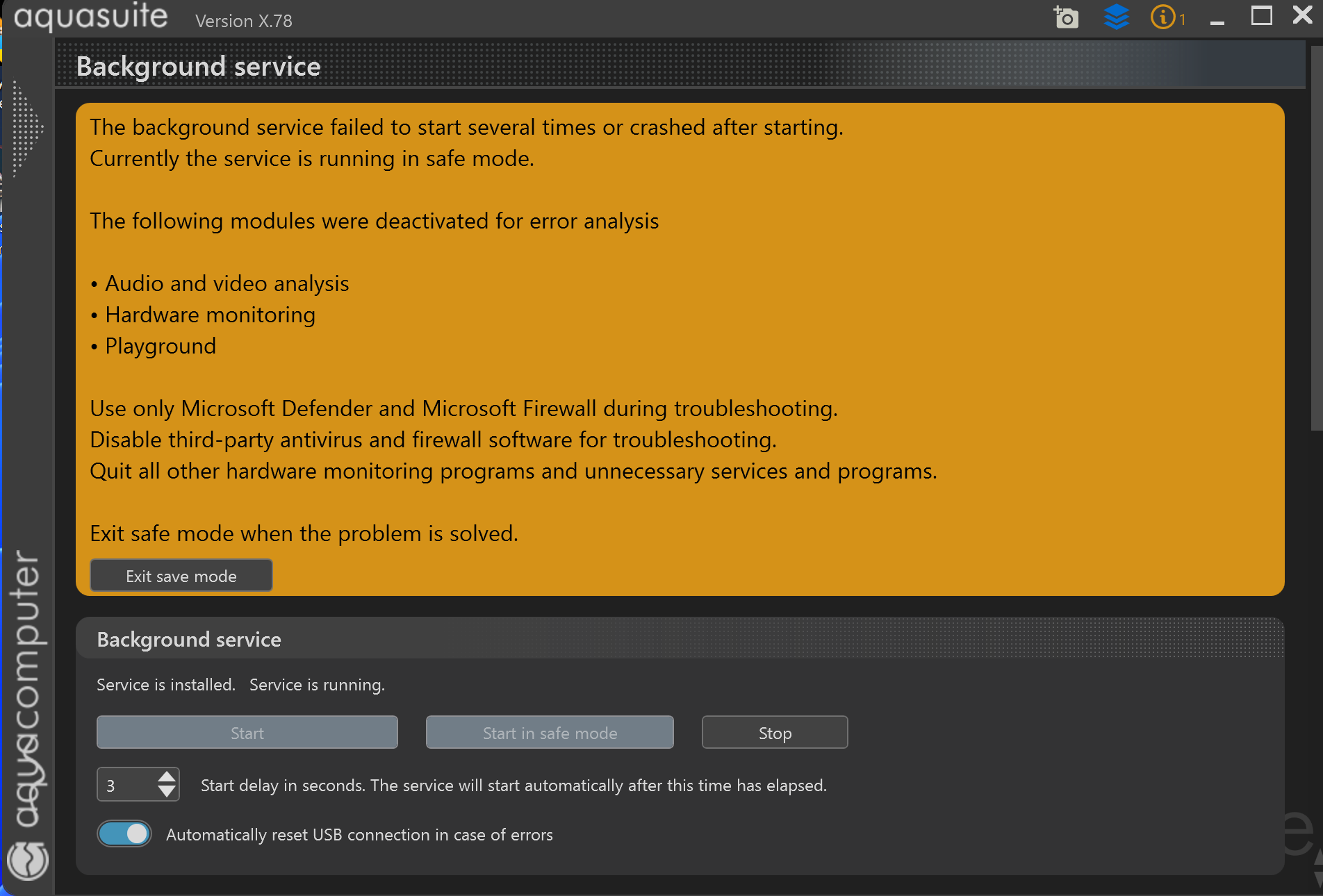 Aquasuite running in safe mode?