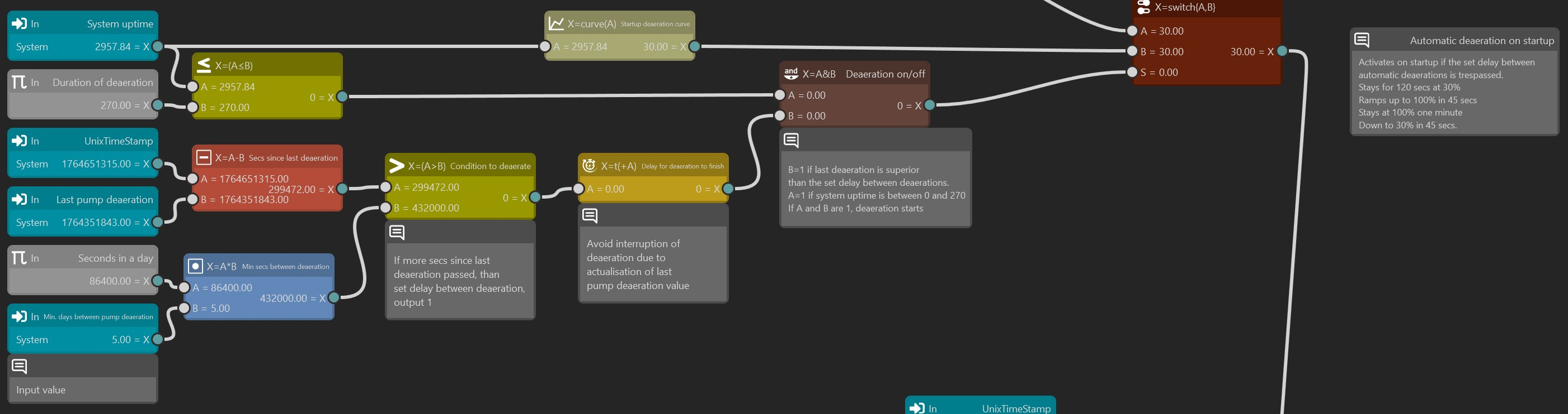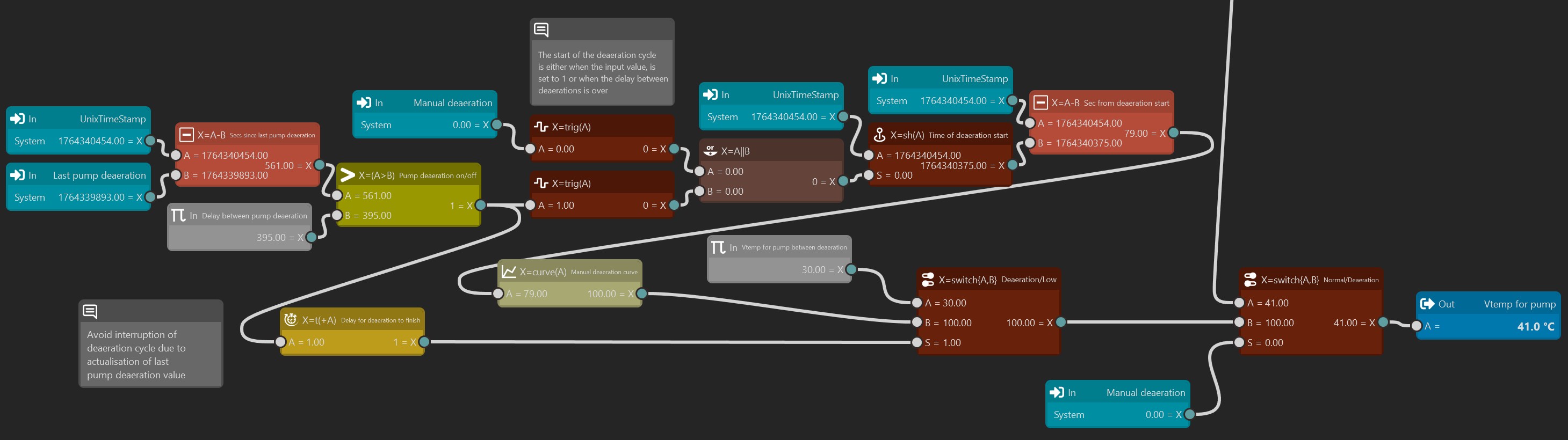 Thanks ! The A input of the last switch is fed with the temperature/pump speed I want, in normal operation, i.e. when the deaeration mode is off, i.e. when the input value of "Manual deaeration" is 0.