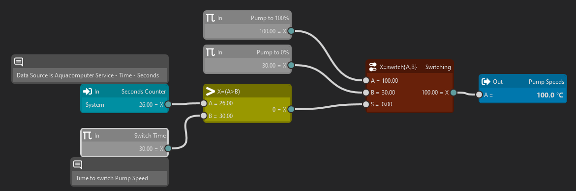 Once the Virtual Sensor is working, the next step is to get its output to control the pump speed. The only way I could see to do this is to go to the D5 Next Sensors section and add this Virtual Sensor. Then in the D5 Next Pump section, set the Mode to Curve Controller, then set the Data Source to the Virtual Sensor you just added. Next set up the curve so half of the curve points have temp and speed equal to the Virtual Sensor low speed value and the other half off the curve points have temp and speed set to the high speed value. This basically makes it a 2-point curve, with the low point set to the Virtual sensor low speed value and the high point set to the Virtual Sensor high speed value. As the seconds counter counts from 0 to 30 seconds, the Virtual Sensor will output 30°C (30% speed). When the seconds counter reaches 31, the output will switch to 100°C (100% speed). When the seconds counter rolls over to 0 the Virtual Sensor output will switch back to 30 °C (30% speed). I do wonder if there is a simpler way to connect the output of the Virtual Sensor to the pump speed control.