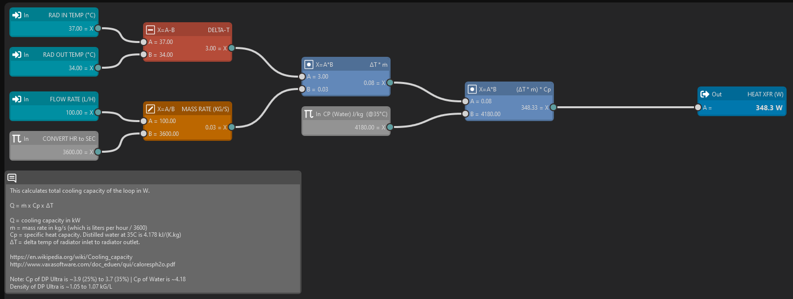 In this example, I put in Constants in for the temp values that would normally be coming in from the 2 temp sensors. Flow Rate is also a Constant that would normally be data coming in from a Flow Sensor. The coolant is assumed to be distilled water which has a specific heat of 4.184 joules per gram per degree Celsius (j/G°C), meaning it takes 4.184 joules of energy to raise the temperature of one gram of water by one degree Celsius. The calculation shows that if the coolant temp at the rad outlet is 3°C lower than the temp at the rad inlet, and the flow rate is 100 L/H, the rad is dissipating 348.3 watts of heat. Some people may say Who Cares but custom loop enthusiasts and engineer nerds (like me) love this kind of stuff. I attached the XML in a zip file if you want to play around with it. Just make a new Virtual Sensor, then import the XML file.