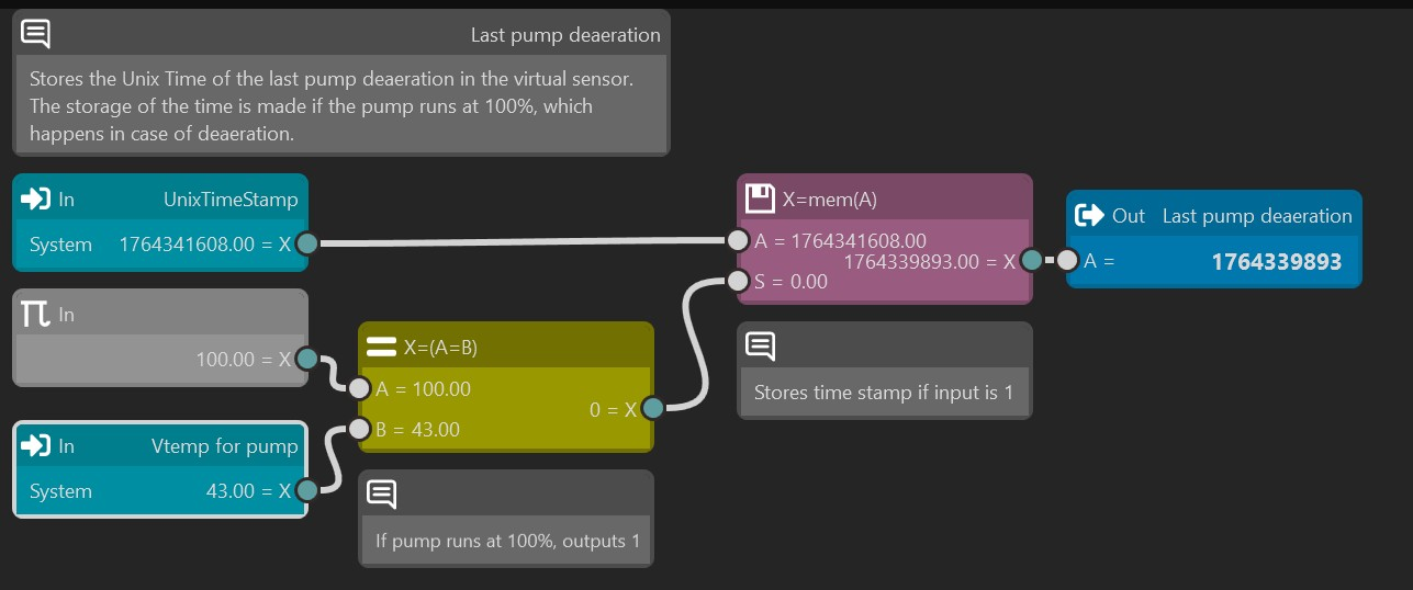 In the latter, the first condition is the input value named “Manual deaeration” with the “Normal/Deaeration” switch on the right. If set to 1, the rest of the diagram applies. If set to 0 it would be your ordinary way to control the pump.